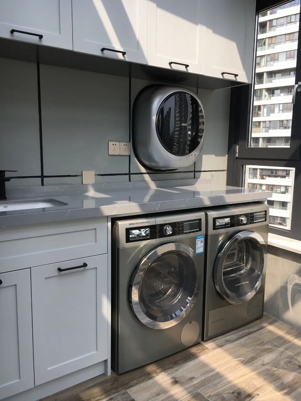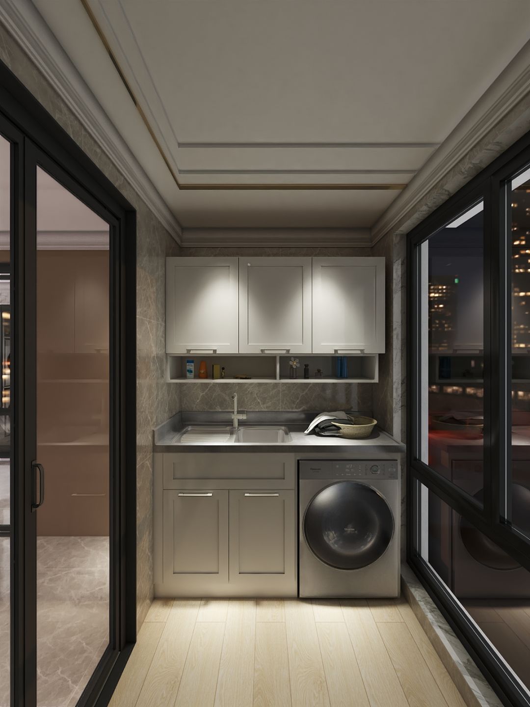 ▲想要高颜值又百搭的阳台柜,可以试试不锈钢木纹烤漆门板,线条简单不繁杂,而且木质温润感超强