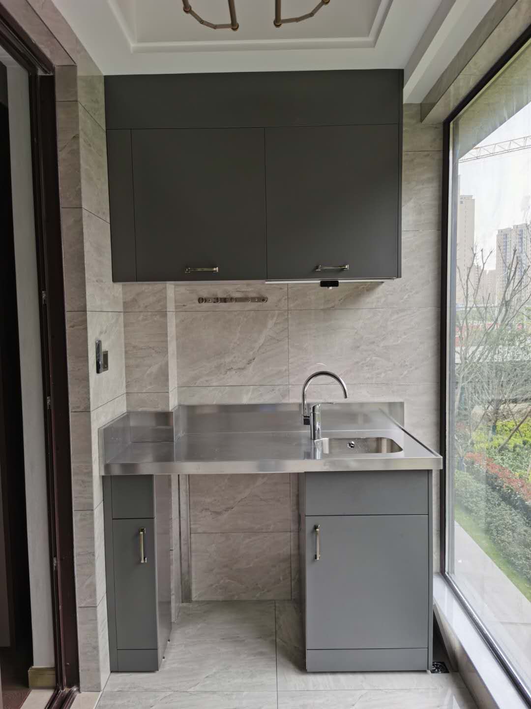 ▲阳台柜的台面最好是选不锈钢一体成型的,不锈钢台面会比较好清洁,日晒雨淋都不怕,比较耐用。